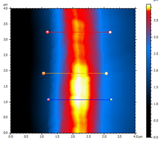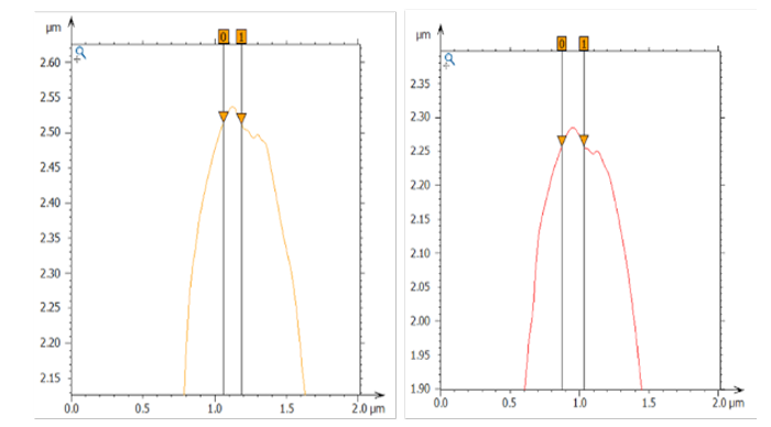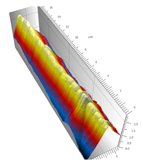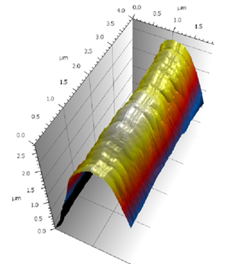 The measurement of the 3D surface topography makes it possible to identify unusual features on the blade surface; for example: the “double groove” seen in Figure 5. In addition, individual line scans on the blade edge can be extracted which enables the calculation of the exact blade radius (Figure 4). In Figure 2, the end radius of the blade is determined at each section, averaging a value between 60-80 nm in the sample’s sections.