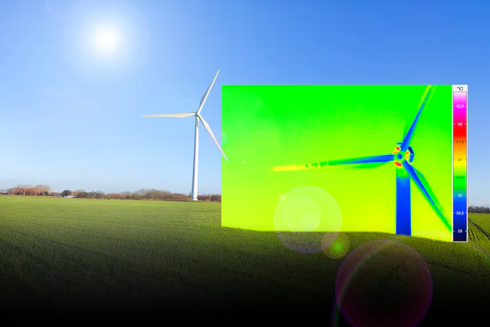 With its sensitivity range in the long-wave atmospheric window, the camera is particularly well suited for outdoor applications. It can resolve distant objects with the highest level of detail, for example when monitoring the condition of wind turbine rotor blades.